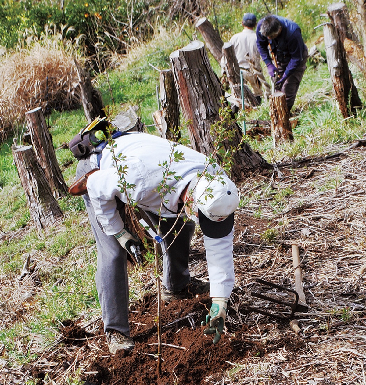 22日にはそれぞれのメンバー10人ほどが参加。スコップで土を掘り、1本1本丁寧に植えていった。