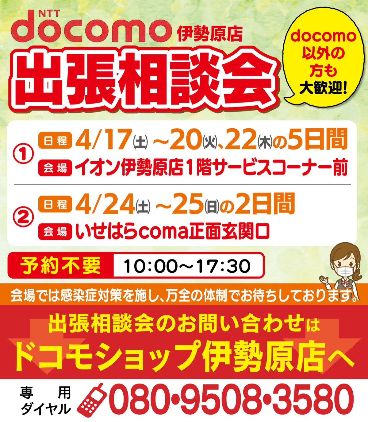 「毎月の料金が高い」「機種変更したい」などガラケーやスマホに関する悩みがある方に朗報!ドコモショップ伊勢原店がイオン伊勢原店といせはらcomaで出張相談会を実施する。