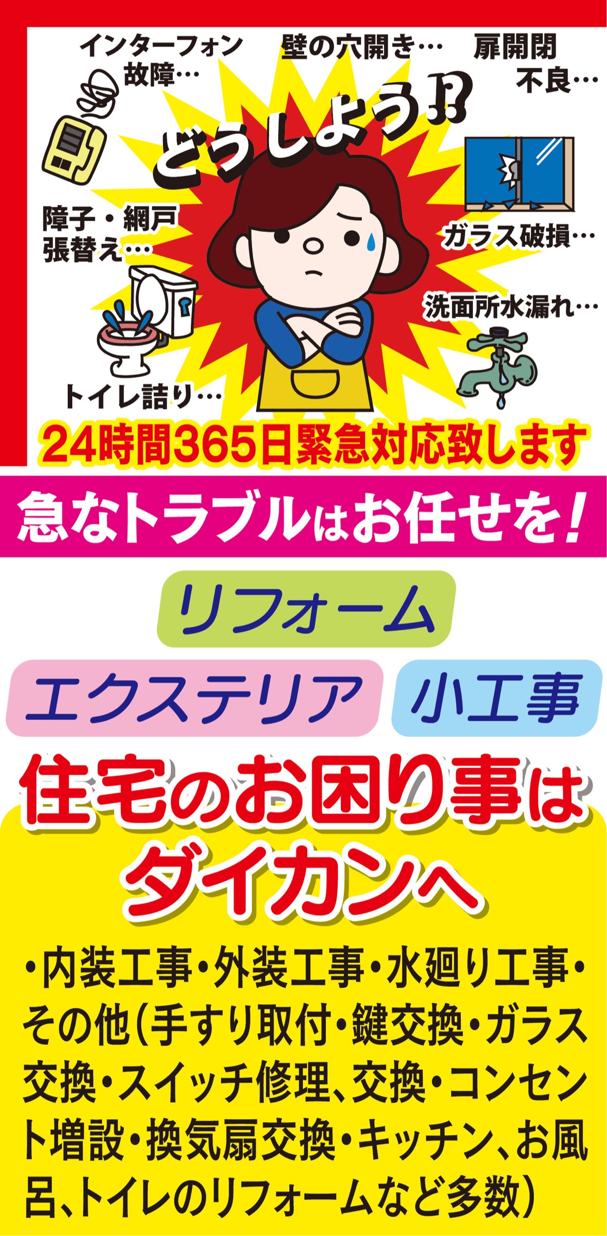 創業18年目を迎えたダイカン株式会社(瀬脇光治社長/伊勢原市東成瀬)は、「リフォーム」「エクステリア」「小工事」を中心に、より良い住環境づくりをお手伝いする会社。また、工場や会社などのメンテナンスも請け負い、業績を伸ばしている。