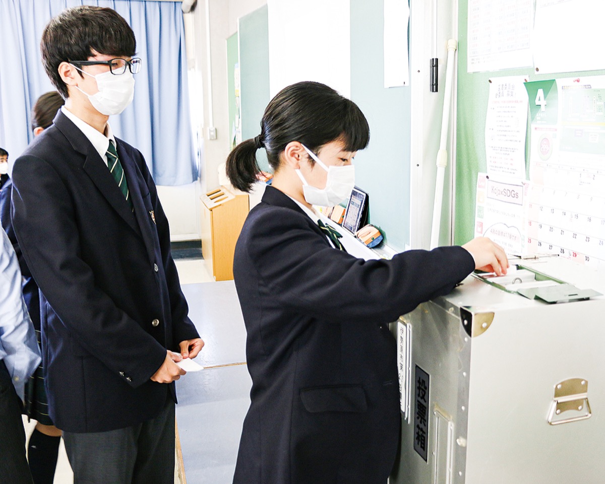 授業の後半では、架空の市長選挙を事例に、模擬公開討論会と模擬投票を実施。同委員会のメンバー3人が、「女性党」「無所属」「平和党」の各候補者役として登壇し、「向上高校の学食について」「仕事・就労について」をテーマに政策を主張。その後、実際の投票用紙と投票箱を使い、各クラスで模擬投票が行われた。