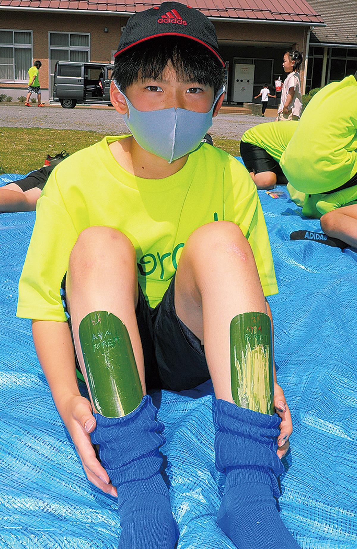 クラブの小学5年生16人とコーチらが参加。町内の竹林整備で伐採した竹の板片をサンドペーパーで加工し、表側に各自の背番号を工具で刻んだ。額に汗をにじませながら、ローマ字表記の名前や日本一にちなんだ富士山の図柄などを黙々と入れ続ける子も。完成品を手に「竹じいが丁寧に教えてくれたので、うまくできた」「世界にひとつだけ。軽くて動きやすい」「着けるとひんやりする」などと感想を語り、笑顔を見せた。
