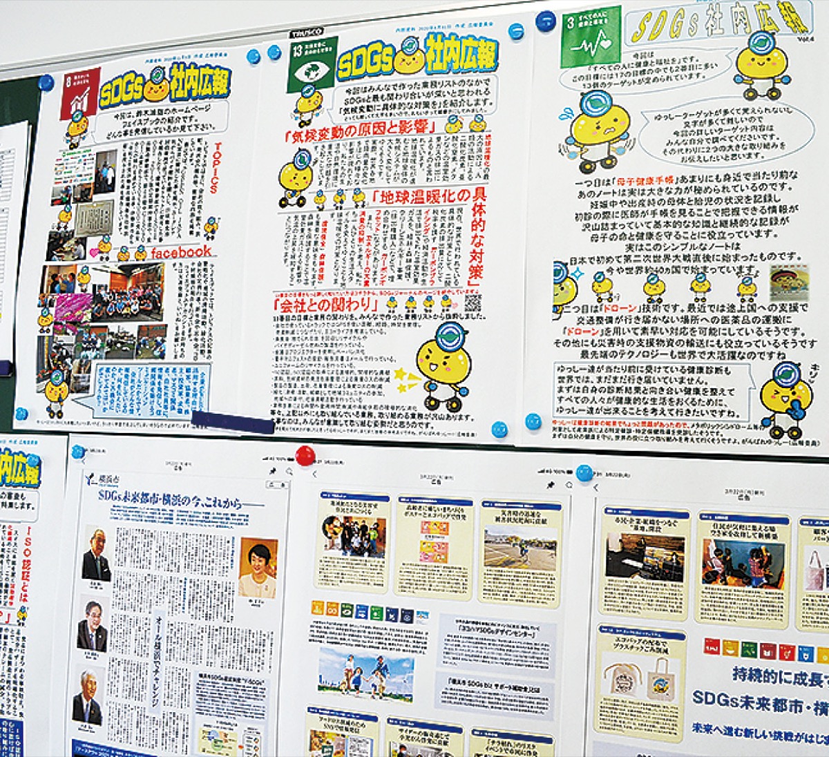 定期的にSDGsを社内啓蒙のため、社内広報を発行し社内に掲示している。広報委員が定期的に「貧困をなくそう」「質の高い教育をみんなに」などそれぞれの目標番号についてわかりやすく解説している。昨年度は「健康経営」をSDGsの目標に設定。従業員の健康診断の結果をもとに、健康のために取り組む項目と数値目標を設定し、社内の健康管理を行う総務と各部門長がサポートしているという。