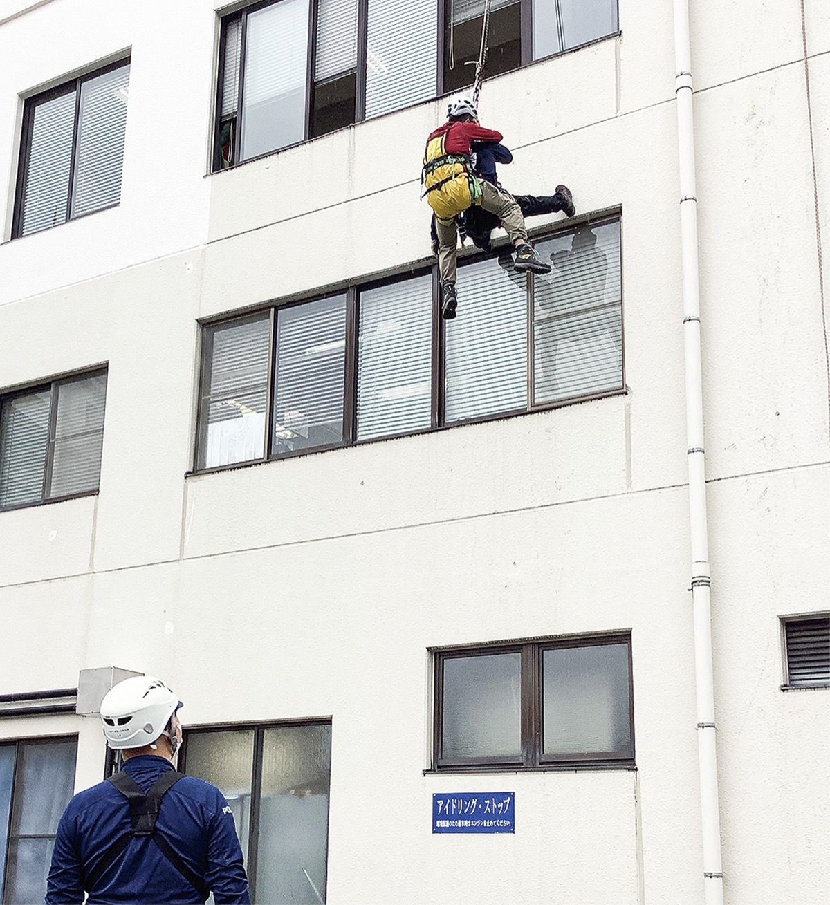 この日は小雨が降る中、3階建ての警察署の屋上からロープを使って懸垂降下する訓練をはじめ、負傷者役をキャリングハーネスという装置を使用して背負い、降下する引き下げ訓練や、背負い搬送訓練などを実施。隊員らは手順を確認しながら声を掛け合い、真剣に訓練を行った。