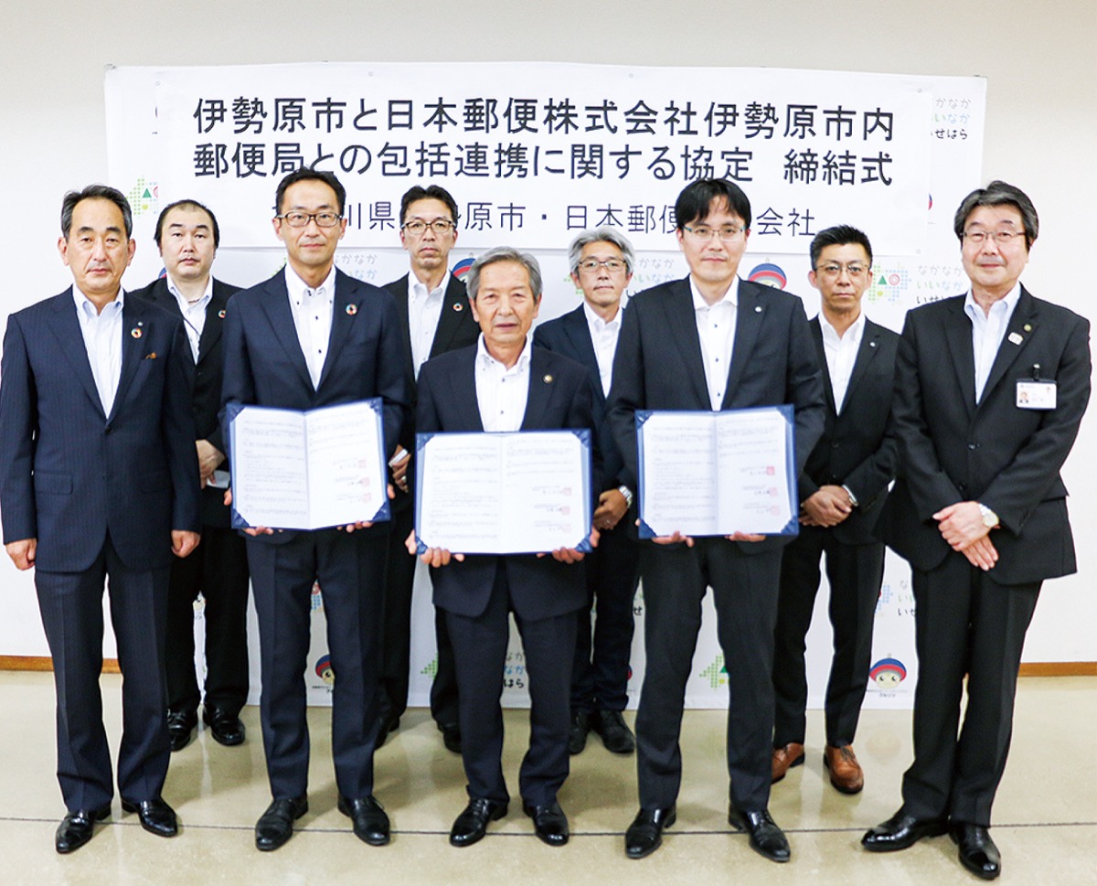伊勢原市は7月1日、日本郵便株式会社の市内8郵便局と、災害や道路、ごみ問題、地域の見守りなど4つの連携事業に取り組む包括協定を締結した。市内に事業所を置く民間と包括協定を締結するのは、今回が初めて。