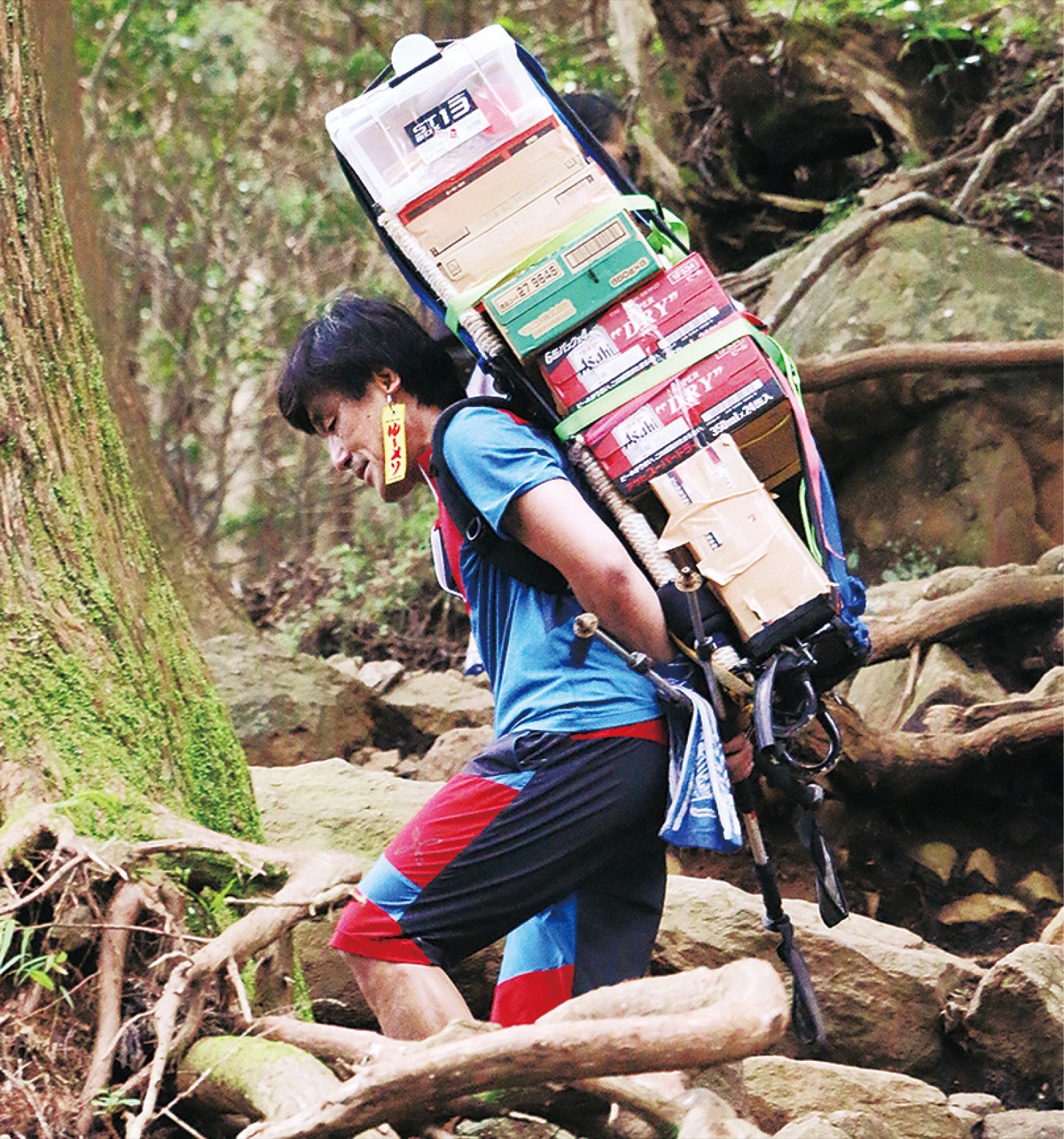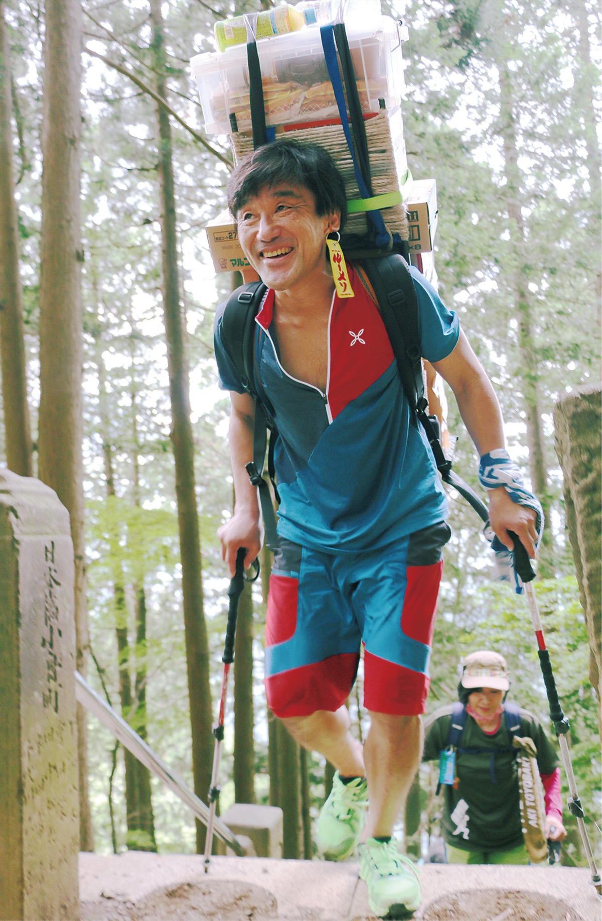 始めた当初は30kgほどだったが、3年ほど前から70kgまで担げるようになったという。「もっと多くの荷物を担ぎたいけれど、万が一転倒したりして登山客に怪我をさせてはいけないので、ここまでと決めている」と話す。