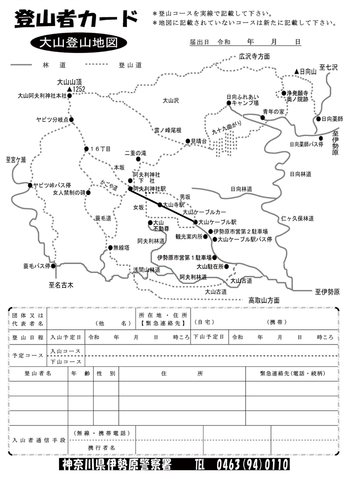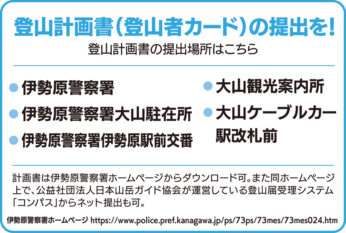 事故に遭った人は登山経験が浅い人や未経験者が多いことから、伊勢原署では注意を呼びかけている。「事前に下調べして装備の準備やご自身の体力などを考えて登山の計画をしてほしい。登山計画書(登山者カード)も必ず提出してほしい」と訴える。