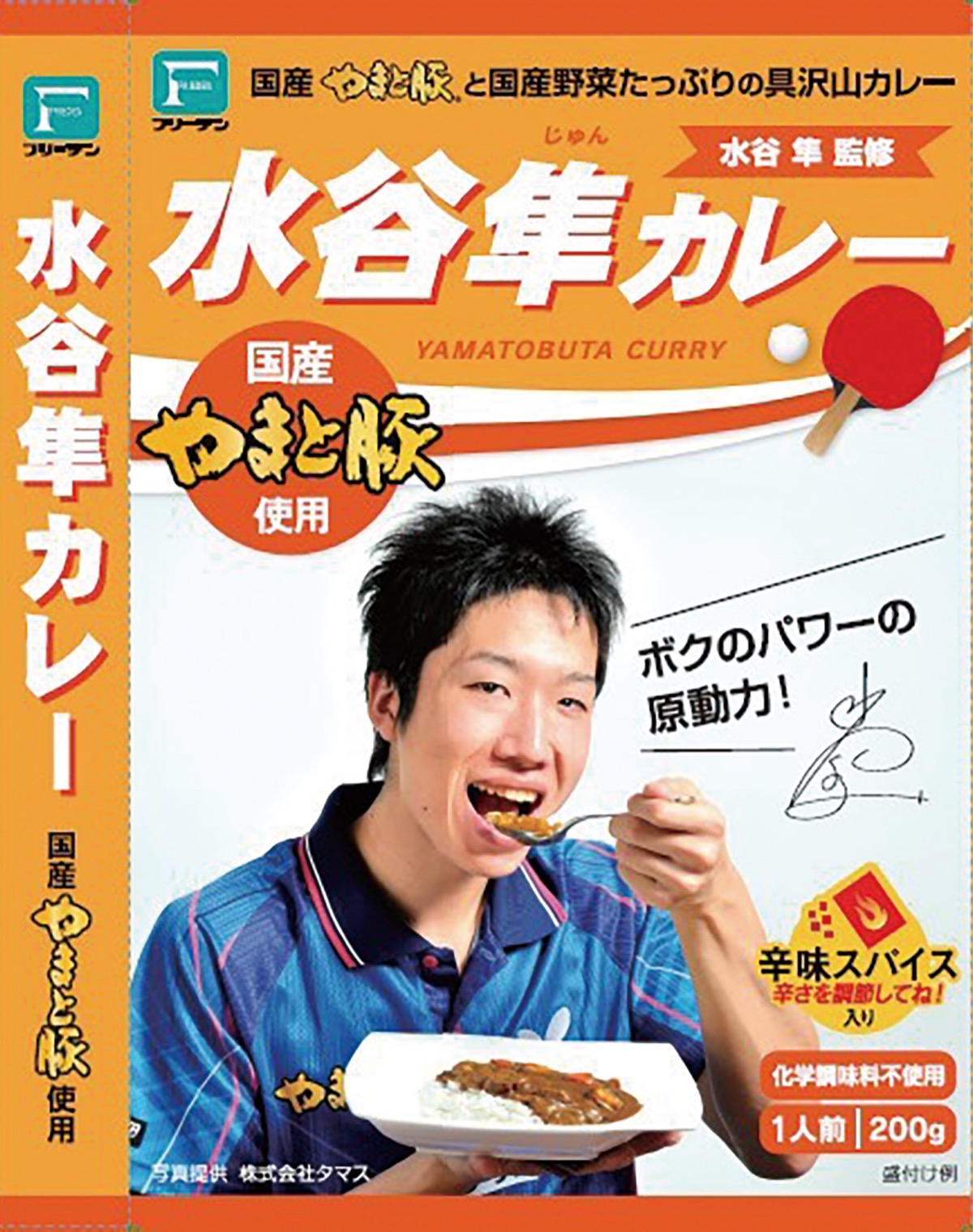 2013年から水谷選手をスポンサードしている同社。「水谷隼カレー」は「海外遠征のときにおいしいカレーを持っていきたい」というカレー好きの水谷選手が監修を務めたレトルト商品で、やまと豚を用いたポークカレーとなっている。