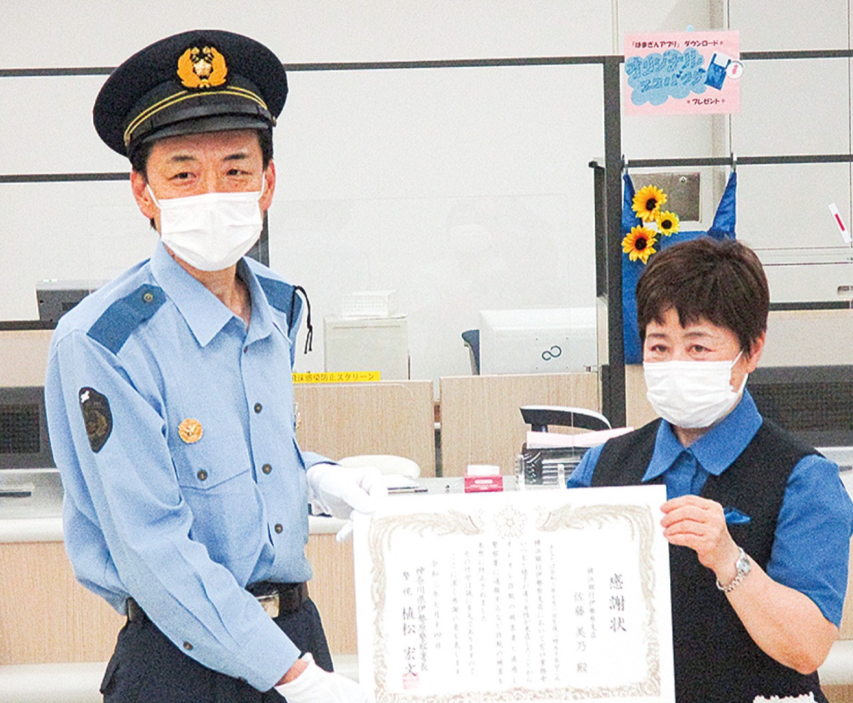 感謝状が贈られたのは同行窓口担当の佐藤美乃さん(60)。今年7月1日、高額の引き出しに訪れた70代の女性に対し、積極的な声かけを実施。預金の引き出しの理由などを聞き出し、詐欺だと確信した佐藤さんらが警察に通報。息子を語って預金を引き出させようとした特殊詐欺被害を未然に防止した。