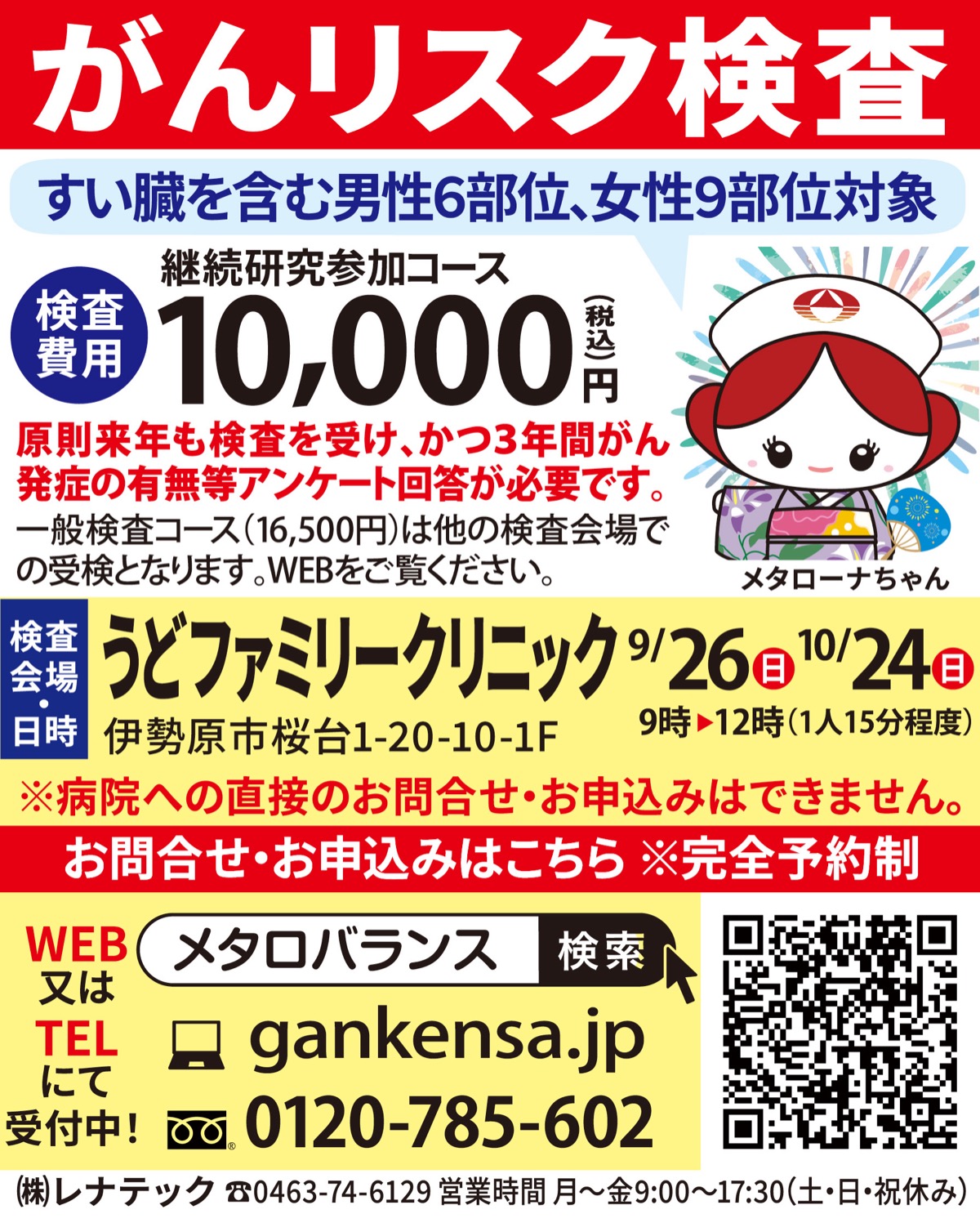 メタロ・バランス検査と呼ばれるこの検査は、神奈川県立がんセンター、千葉県がんセンター、(株)レナテックが共同研究を経て2019年4月に実用化され全国で既に2万6千人以上が受検しているという。検査は完全予約制。WEBまたはTELで申込みを。