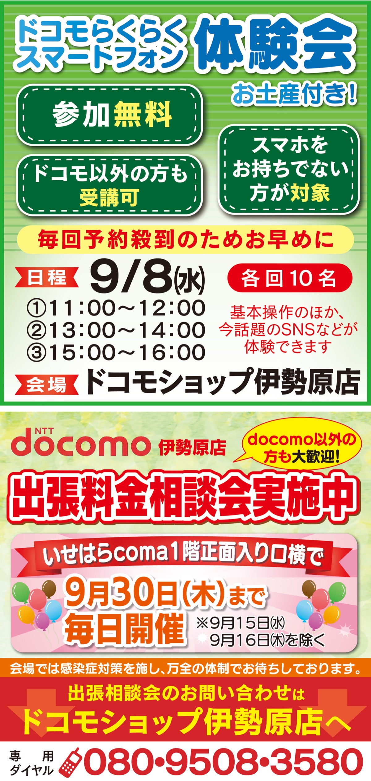 ガラケーやスマホについて聞きたいが「店まで行くのが面倒」「予約が大変そう」とためらっている人のために、いせはらcoma1階で、9月末まで(15日(水)、16日(木)定休日)、出張相談所を開設している。料金相談はもちろん、他社からの乗り換えや、機種変更まで何でも答えてくれるので、買い物ついでに立ち寄れるのが嬉しい。「感染対策も徹底しているので、ぜひお気軽にお立ち寄りください」と同店。