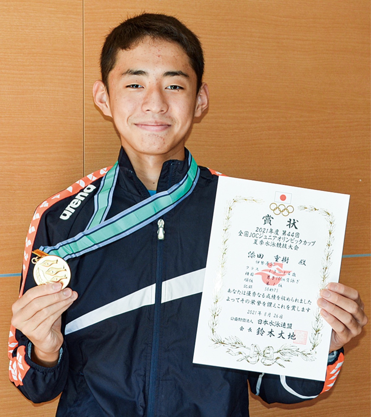 大阪府内で8月21日から26日まで開催された「全国JOCジュニアオリンピックカップ夏季水泳競技大会」で、伊勢原スイミングクラブ所属の添田重樹さん(笠窪在住/逗子開成中学校・高等学校3年)が、13歳〜14歳クラスの男子100m背泳ぎで優勝した。