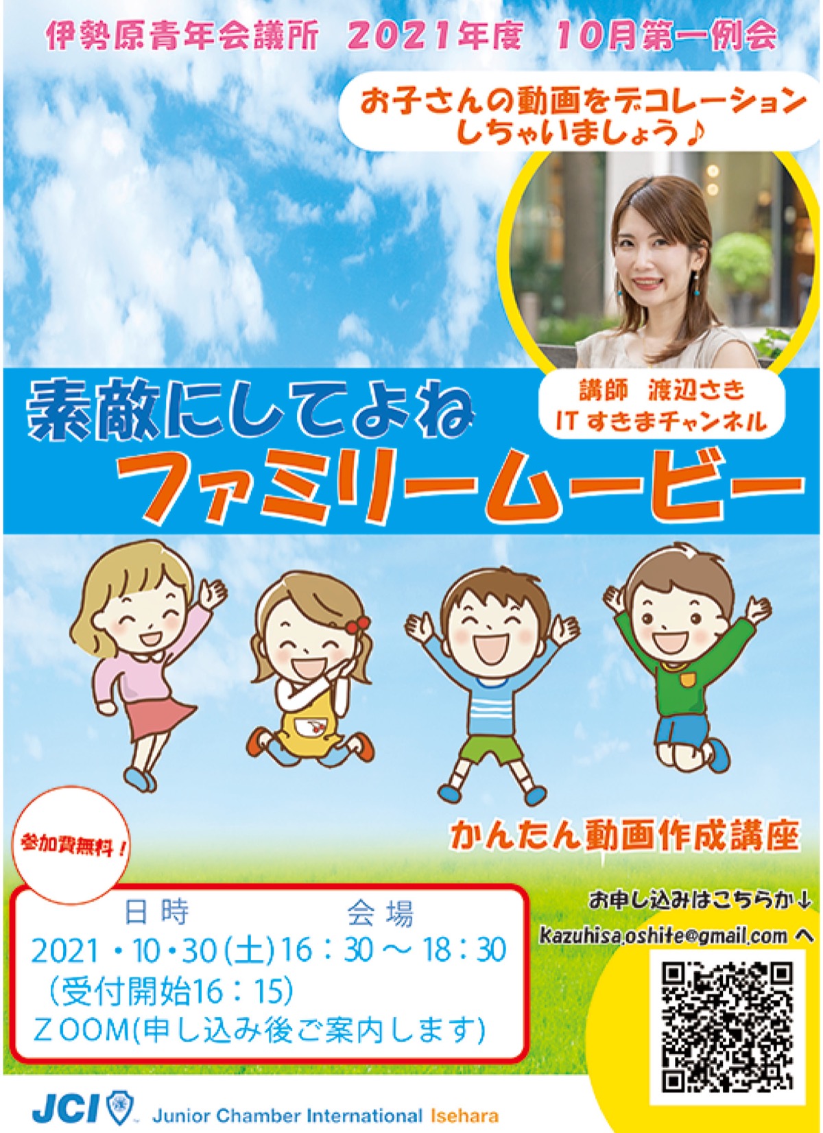 伊勢原青年会議所(伊勢原JC/中村こずえ理事長)が10月30日(土)、10月第一例会で「かんたん動画作成講座」をZoomで開催する。午後4時半から6時半まで。参加無料で定員は70組。