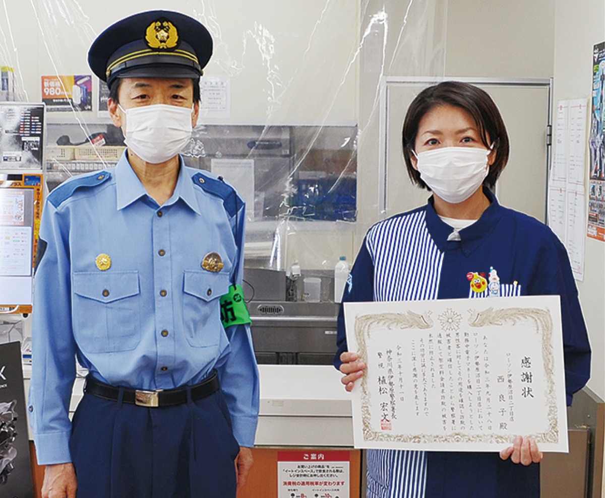 伊勢原警察署(植松宏文署長)が10月11日、ローソン伊勢原沼目二丁目店に勤務する西良子さん(池端在住・43)に、同店で感謝状を贈呈した。