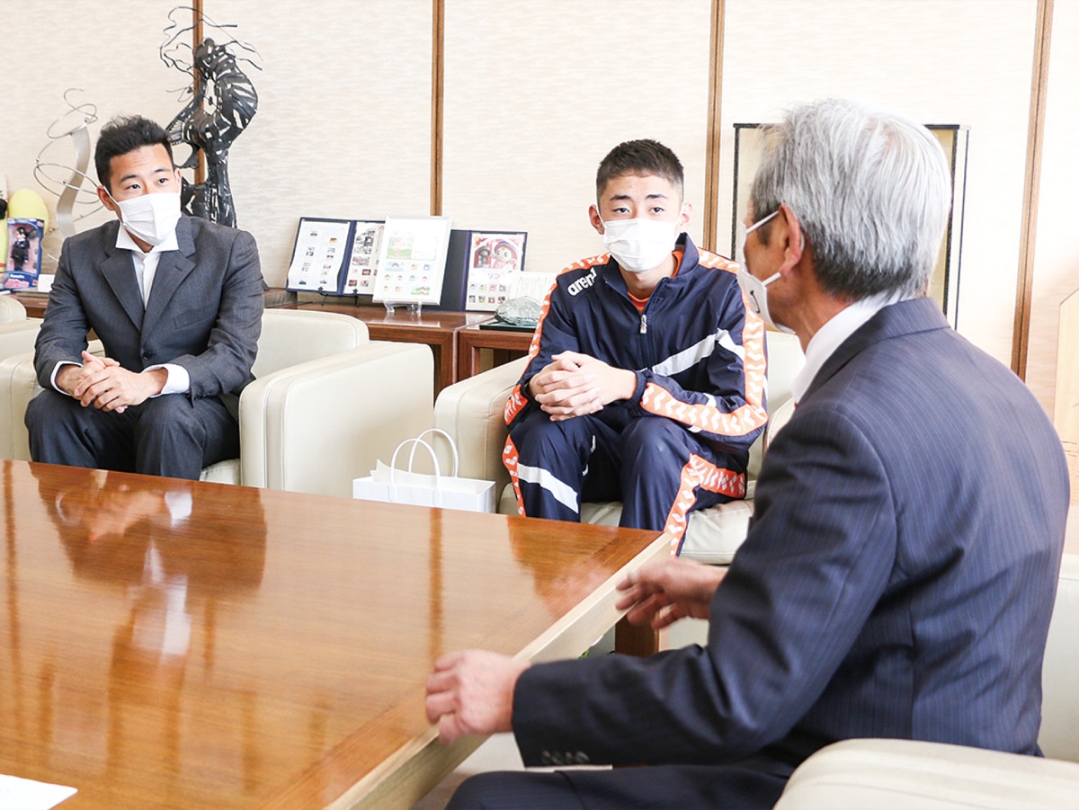この日は、添田さんと祖父の一郎さん、同スイミングクラブで添田さんを指導する高木裕司主任コーチの3人が市長公室を訪問。添田さんは「200mは予選落ちで悔しい思いをしたので、100mでは挽回しようと思った。優勝できて素直にうれしい」と話した。また、「高校に行ったらインターハイで良い成績が残せたら。将来はオリンピックにも出たい。そのために練習を頑張ります」と抱負を語った。