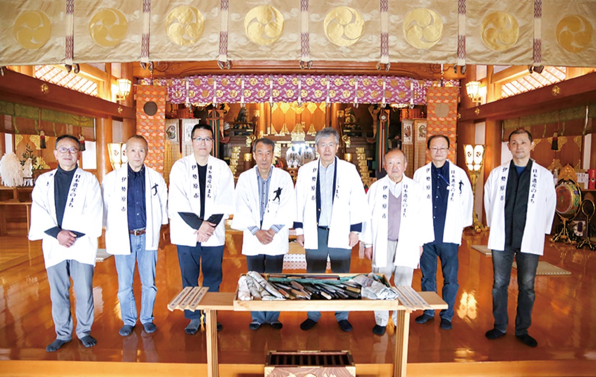 鮮魚商や仲買人らでつくる、小田原魚市場買受人組合(古川孝昭組合長)の有志11人が10月20日、大山阿夫利神社の下社を訪れ、木太刀の代わりに寿命を迎えた包丁を奉納する「納め包丁」を行った。