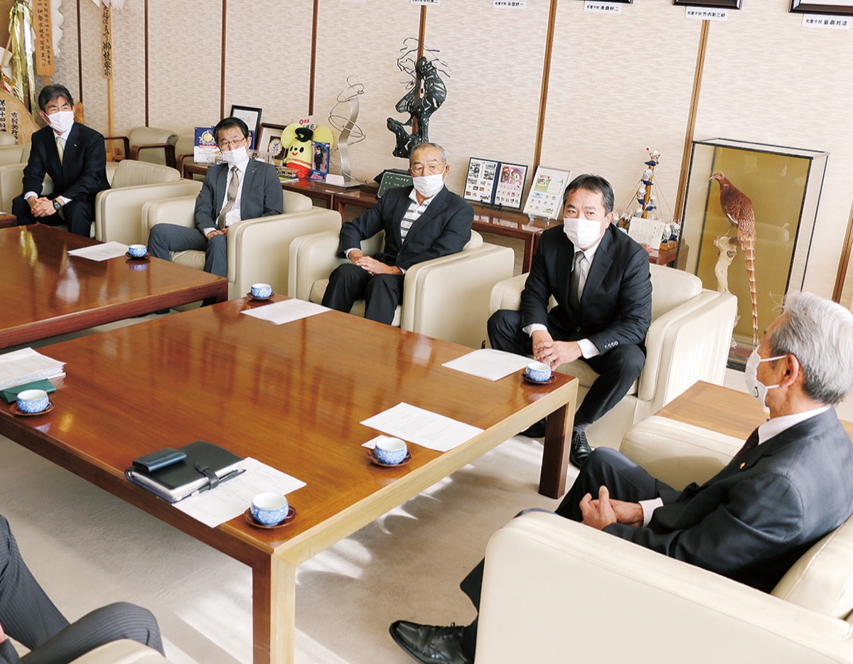19日に市役所を訪問した杉山理事長は「市民が待ち望んでいる駅前の街づくりに向けて、権利者全員が同じ方向を向いて一日も早い事業化をめざしていきたい。市の方でもこれからも変わらないお力添えを頂ければ」などとあいさつ。都市再開発法の規定に基づき、市に対して技術的援助の依頼をした。