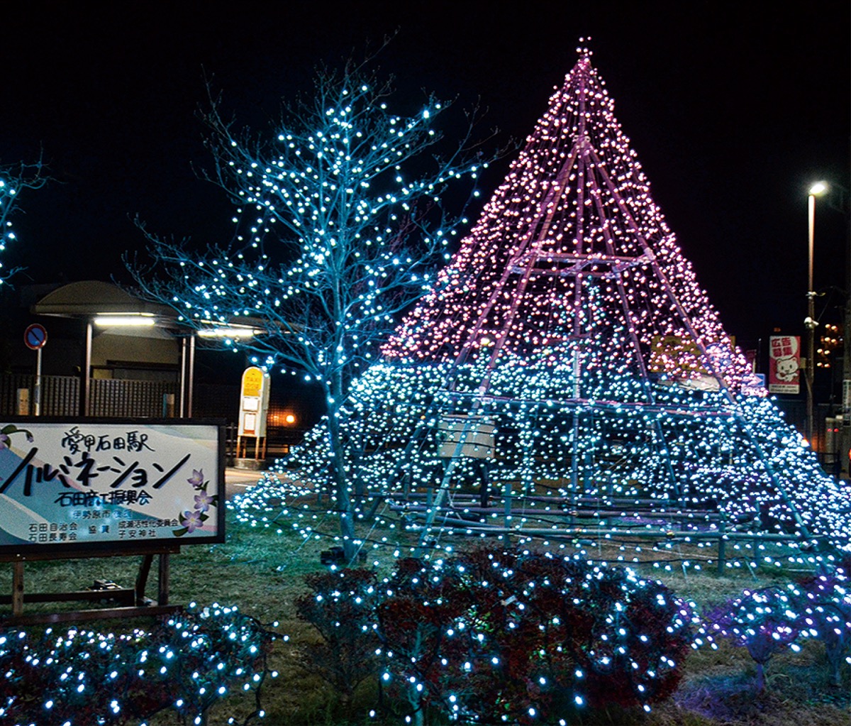 大山に当たる初日の出をイメージし、約8100球のLEDライトで作られたイルミネーション。設置は同商工会会員と石田自治会、成瀬活性化委員会、子安神社、石田長寿会など地元住民が協力して行った。