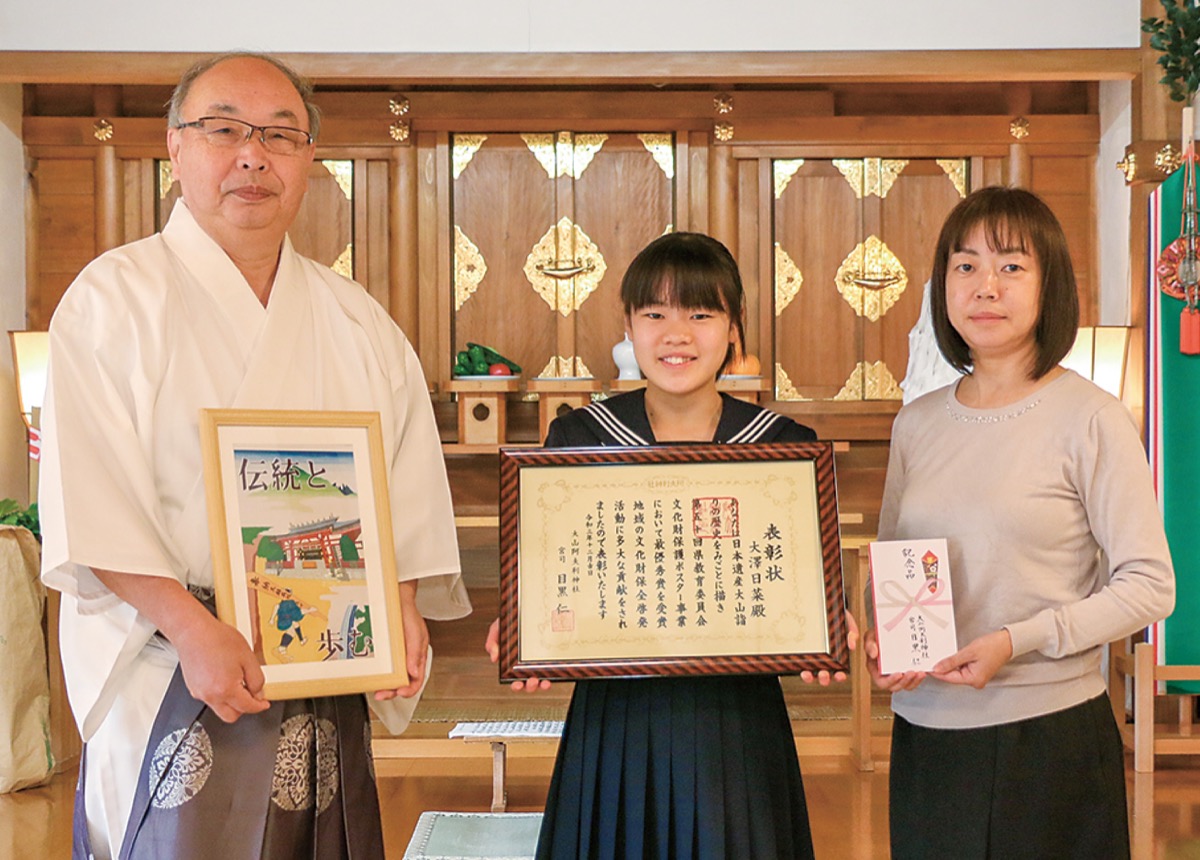 地域の文化財保全啓発活動に多大な貢献をしたとして、成瀬中学校3年の大澤日菜さんが12月25日、大山阿夫利神社から表彰された。この日、大澤さんは家族と一緒に社務局を訪れ、目黒仁宮司(68)から表彰状と記念品を受け取った。