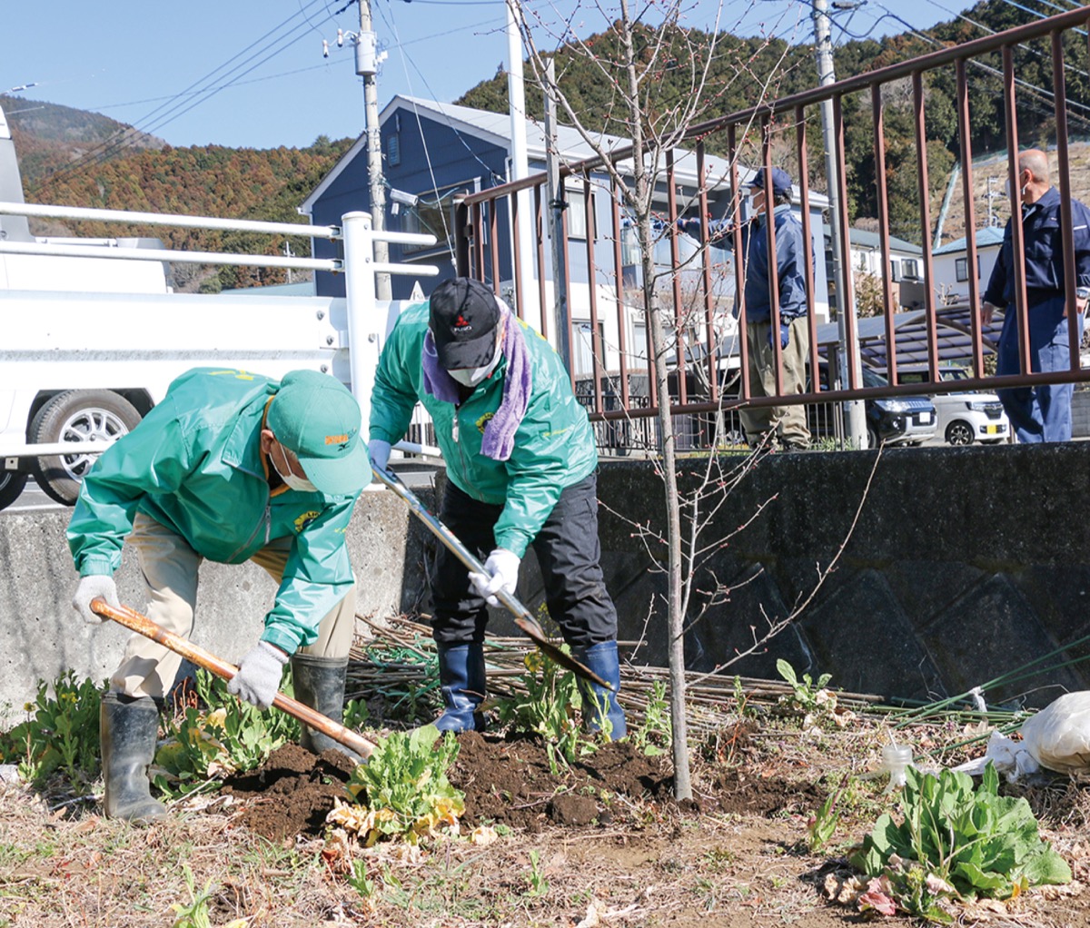 この日は、同クラブのメンバー14人が参加。おかめ桜の苗木を植えたほか、これまでに植樹した木に追肥をするなど手入れを行った。