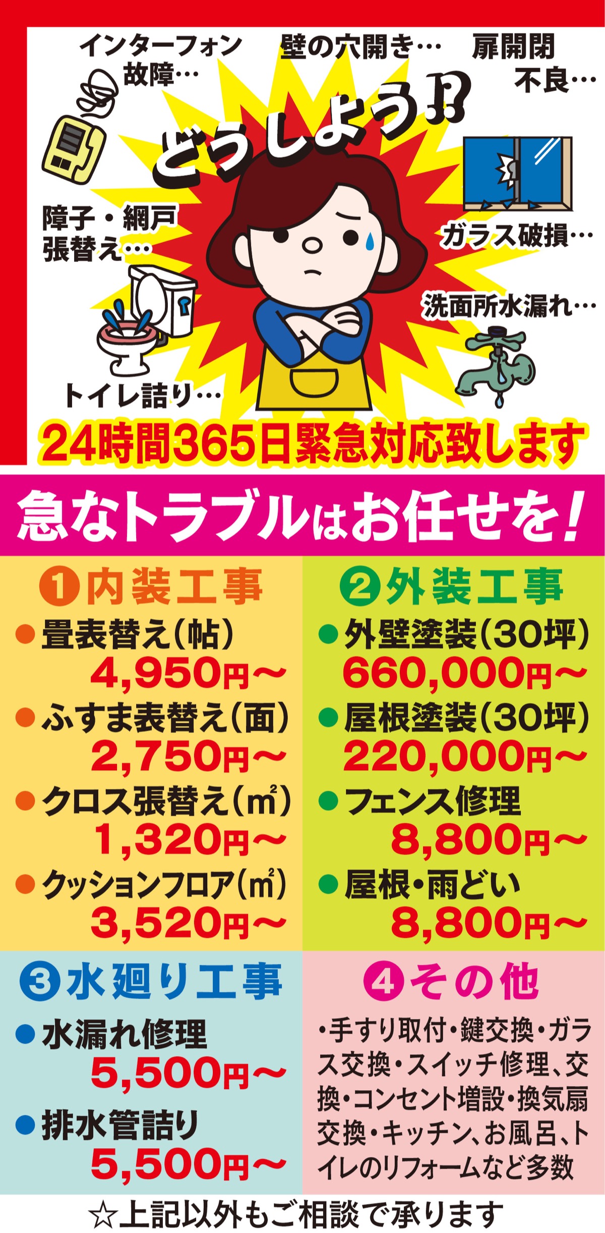 「水漏れ工事」や「手すり取付」等の小さな工事はもちろん、「キッチン・バスの入れ替え」などのリフォーム全般、お庭や外構のエクステリア、ウッドデッキ、住まいのことなら何でもお任せ。24時間365日体制の緊急対応など頼りになる地域密着の会社として伊勢原市や秦野市からのリピーターも多い。