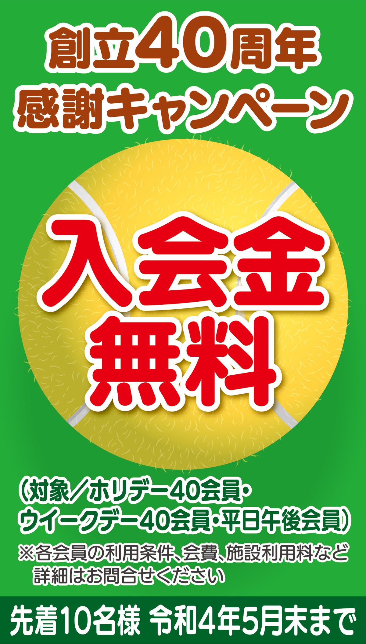 「湘南平テニスクラブ」が創立40周年を迎え入会金が無料になる感謝キャンペーンを5月末まで実施中(左表)。