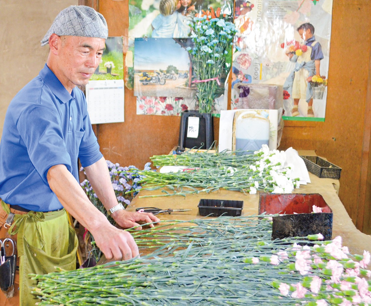 こまめな水やりを徹底するほか、出荷作業の際は、茎の曲がりや花の状態などを1本ずつ丁寧に確認しているという熊澤さん。同園では1輪だけ咲くスタンダードタイプや、枝分かれして小さな花がたくさん咲くスプレータイプなど、約16種類のカーネーションを栽培。消費者にさまざまな色の花を楽しんでもらおうと、青や紫色に染め上げたカーネーションの出荷にも取り組んでいる。
