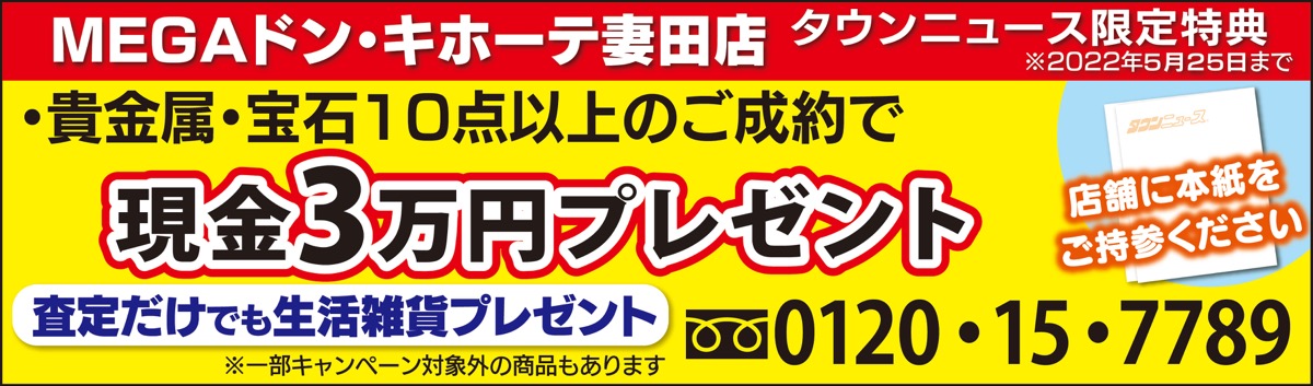 買取専門店「おたからやMEGAドン・キホーテ妻田店」は、貴金属・宝石の買取強化キャンペーンを実施中。10点以上の成約で現金進呈の特典があり、スタッフは「昔使っていたアクセサリー、指輪からはずれた宝石など、他店で断わられた品もぜひご相談ください」と話す。
