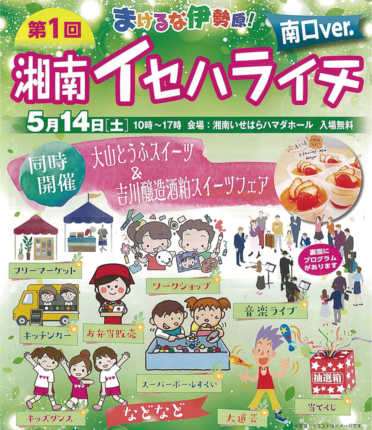 湘南いせはらplace(伊勢原駅南口から徒歩30秒、桜台1の4の31)で5月14日(土)、同施設のこけら落としイベント「第1回湘南イセハライチ」が開催される。NPO法人イセハライク主催、濱田精麦株式会社、イセハライクボランティア、トモスクラブなどの協力で行われる。
