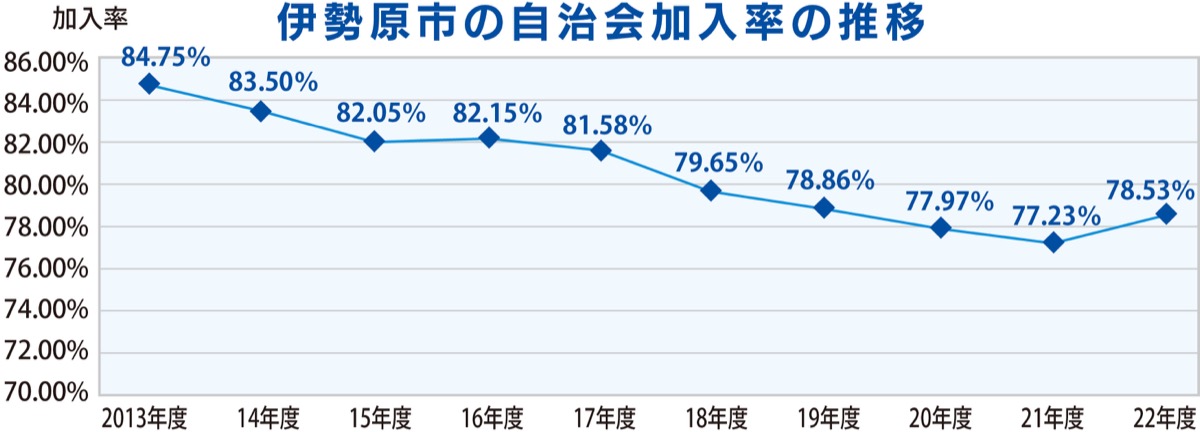 昨年度の総務省による実態調査では自治会等の加入率は全国平均で71・8%。県内では三浦市が94・8%と最も高く、次いで横須賀市の81・6%、鎌倉市の79・3%、伊勢原市と続く。周辺では平塚が69・2%、厚木が60・8%、秦野市が59・8%となっている。