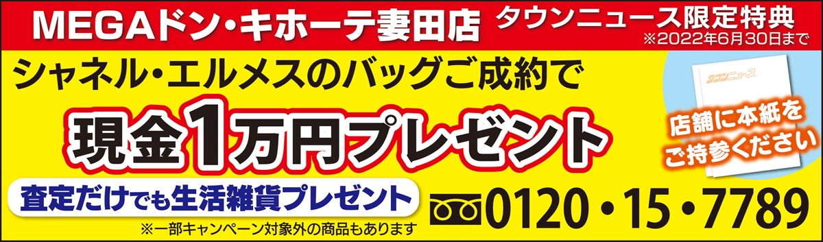 買取専門店「おたからやMEGAドン・キホーテ妻田店」は、シャネルとエルメスの買取を強化中。6月中はバッグの買取成約で現金1万円を進呈しており、スタッフは「使わなくなったバッグはぜひご相談ください。古くても壊れていても問題ありません」と話す。