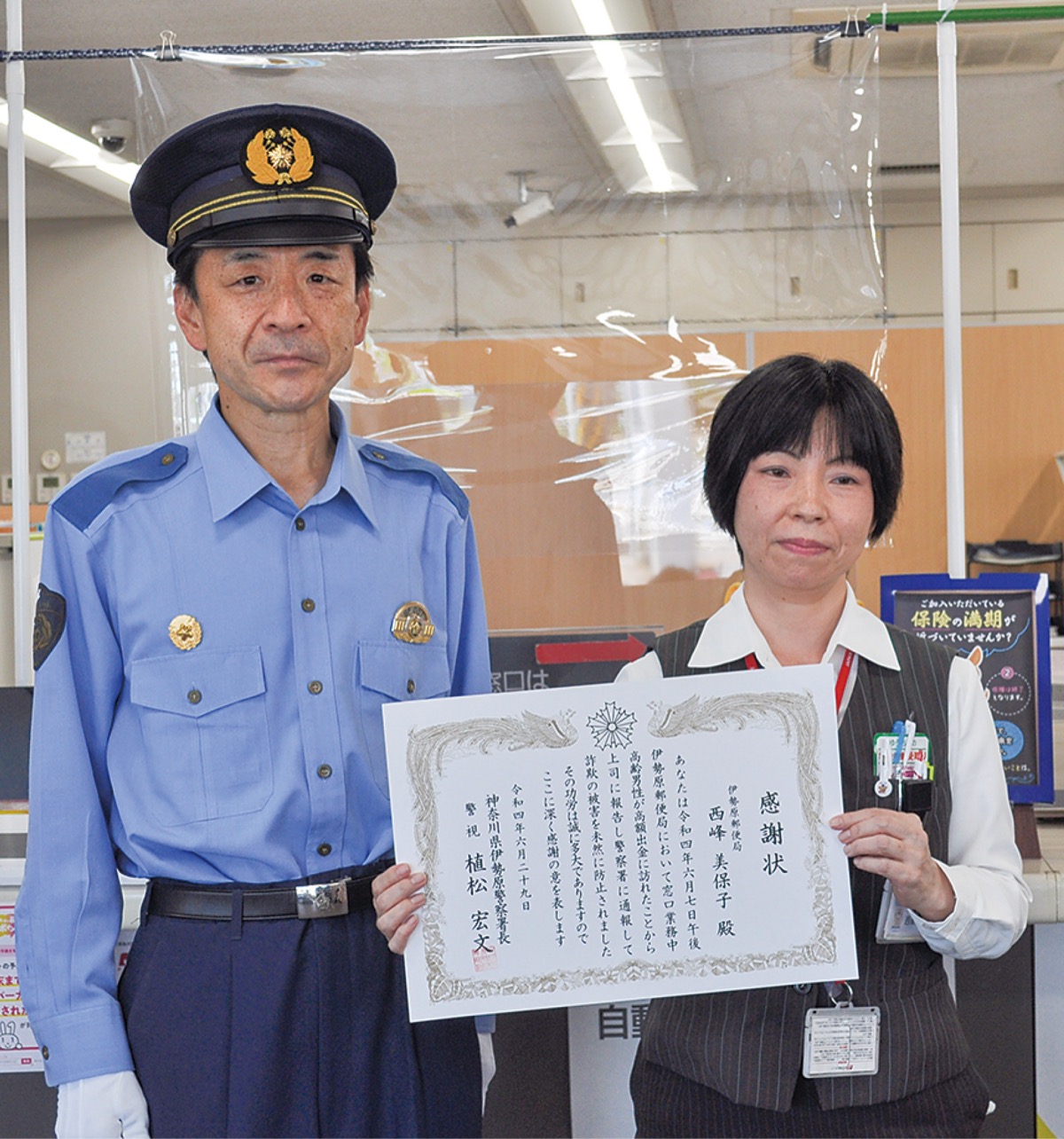 500万円の詐欺被害を未然に防いだとして伊勢原警察署(植松宏文署長)は6月29日、伊勢原郵便局(向後正樹局長)窓口営業部の西峯美保子主任に感謝状の贈呈を行った。