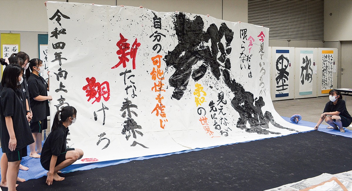 また20日には、縦3m、横5mほどの模造紙に、軽快な曲に合わせて文字を書いていく「書道パフォーマンス」が行われた。パフォーマンスではチームで考えた言葉を色鮮やかな文字で表現。特に大きな筆で書かれた「翔新」の言葉には「新たな未来へ翔けろ」というメッセージが込められていた。