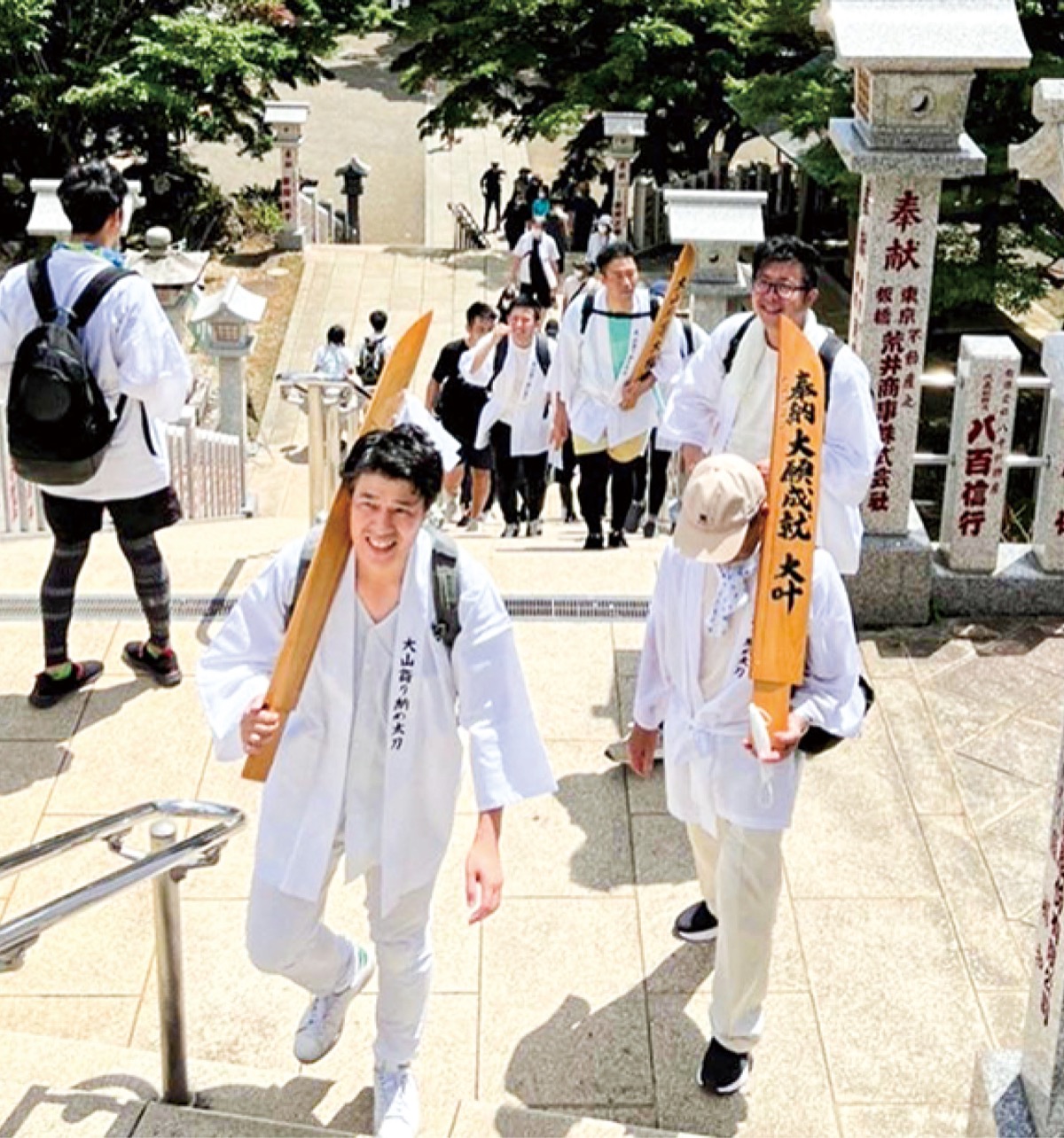 伊勢原JCは、必勝祈願のために大山に登頂し、太刀を納める「納め太刀」の文化を後世に伝えようとイベントを企画。新型コロナウイルス感染症の拡大防止を鑑み、JCメンバーとメンバーが声を掛けた16人が参加した。