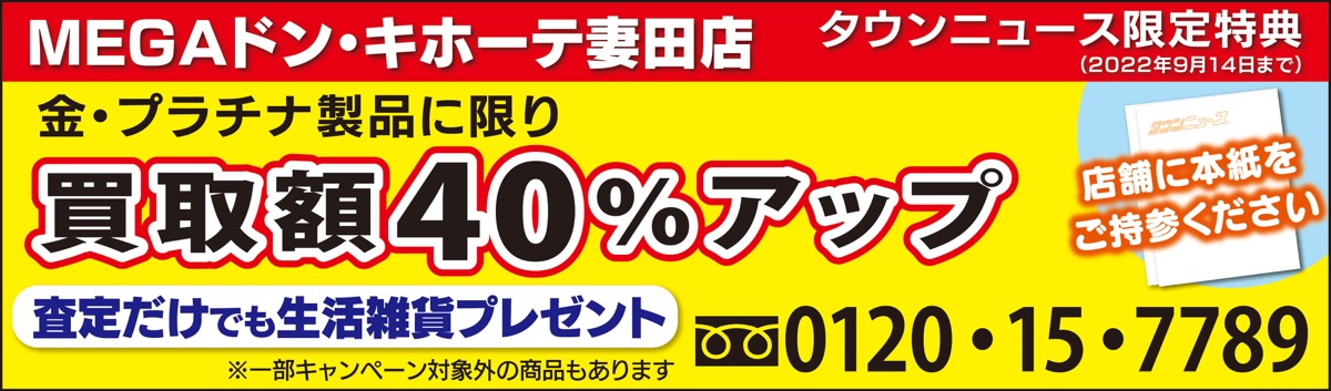 買取専門店「おたからやMEGAドン・キホーテ妻田店」は、金・プラチナ製品の買取を強化中。9月14日までの期間は、通常時より買取金額が40%アップとなる。スタッフは「金・プラチナの売り時かもしれません。ご自宅に不要になったネックレスやリング、眼鏡などはありませんか」と話す。