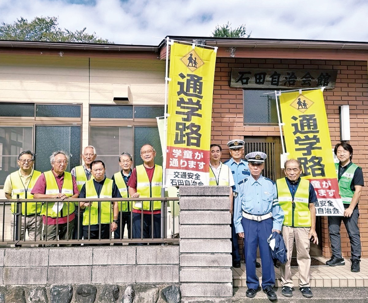 石田自治会(飯原和夫会長)が9月25日、同自治会内の要所に、通学路であることを示すのぼり旗を設置した。