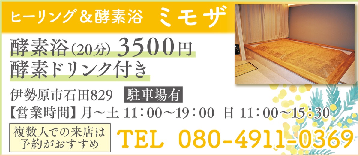 肌寒さを感じる今日このごろ。美容と健康のために、この時期からの「冷え」対策はいかが。10月5日にオープンした「ヒーリング&酵素浴ミモザ」では、話題の酵素浴で体を芯から温められる。酵素浴は20分3500円(酵素ドリンク付)。手ぶらで来店できる充実の設備で、エステの施術プランもご用意。今なら先着で、自宅で酵素浴を楽しめる「入浴剤」をプレゼント!お気軽にご来店を。