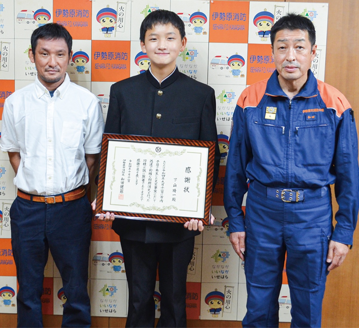 伊勢原市消防本部(和田健一郎消防長)が10月11日、市内子易で発生した火事の初期消火などに貢献したとして、下山晴一さん(山王中1年)を消防功労者として表彰。表彰式を行い、和田消防長が感謝状を贈呈した。
