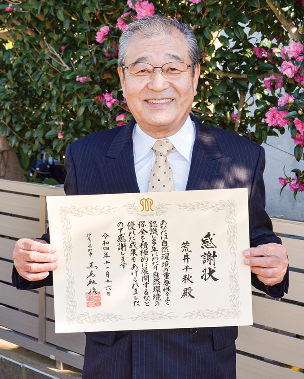 市内東富岡在住の荒井千秋さん(72)がこのほど、県自然保護功労者表彰を受賞した。同表彰は、みどりの保全と創造、自然公園の保全、野生鳥獣の保護など良好な環境の確保やその普及啓発に努めた功績を称えるもの。