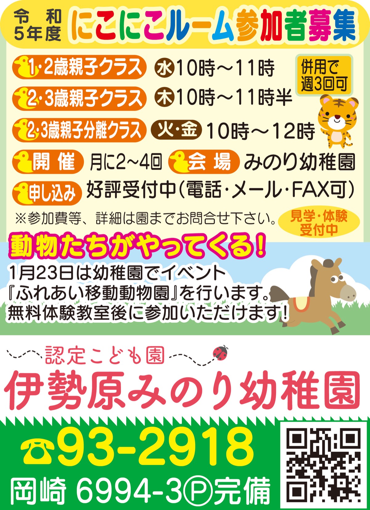 認定こども園・伊勢原みのり幼稚園では12月13日(火)、来年1月23日(月)に未就園児教室『にこにこルーム』の無料体験教室を開催する(要予約)。