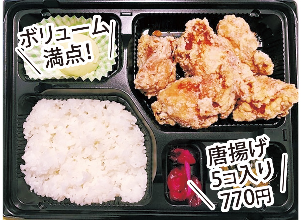 ボリューム満点で人気の唐揚げは毎日手作り。(弁当770円/単品・5個入495円)。「韓国風唐揚げ弁当」(770円)も人気で、オリジナルピリ辛ダレとネギの風味が毎日食べても飽きないほど。「新年も1日から営業するのでご家族連れでのご来店お待ちしています」と同店。