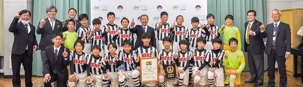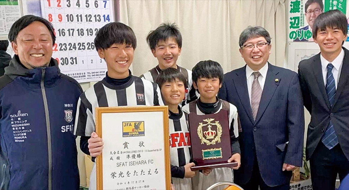 昨年12月に開催された少年サッカーの第4回チャレンジカップU-12で準優勝したSFAT ISEHARA SC(川嶋正人総監督)が1月7日に渡辺紀之県議会議員、17日に高山松太郎市長を表敬、大会結果を報告した。