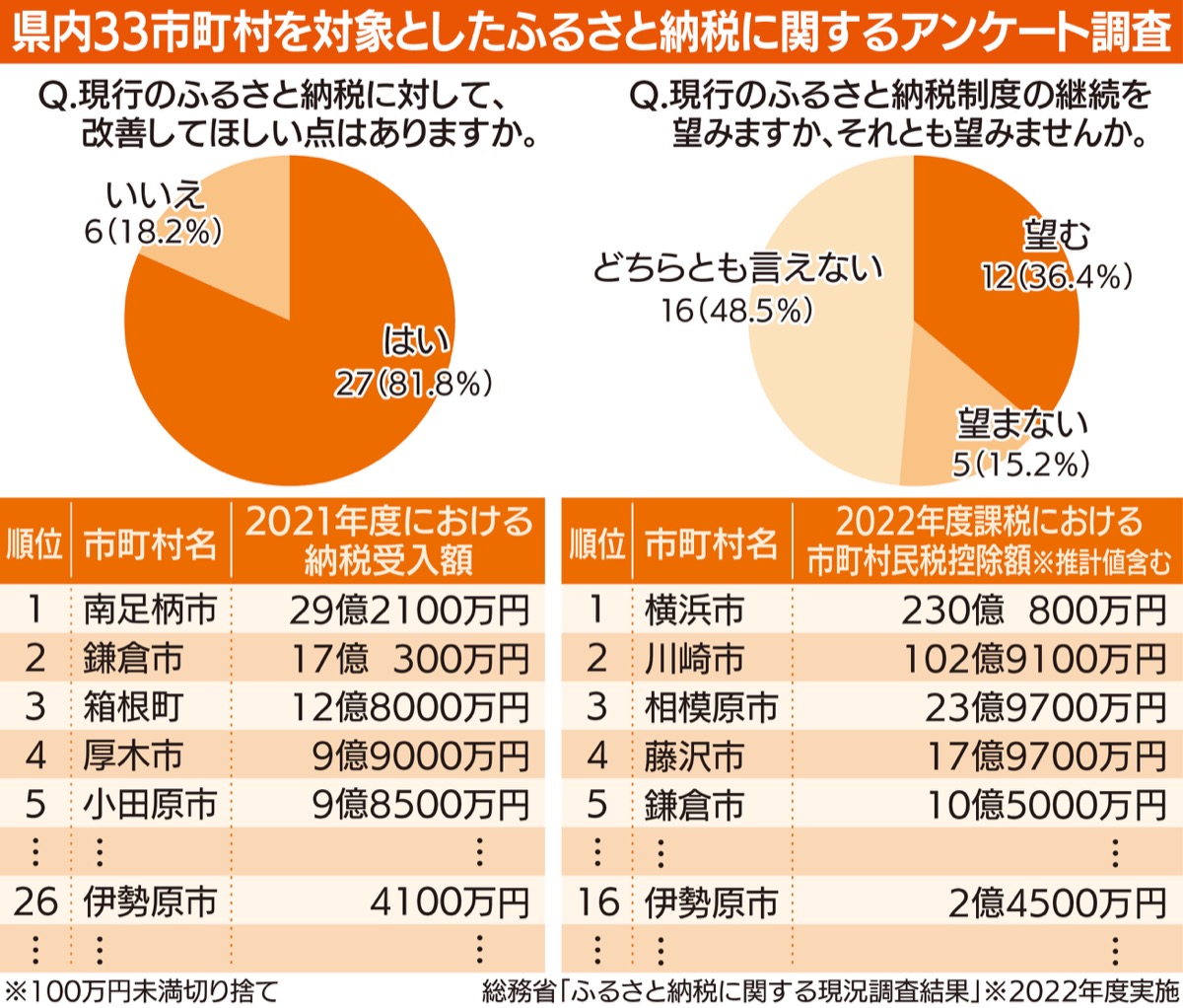 タウンニュース社では「ふるさと納税」に関する神奈川県内の自治体の受け止めなどを探るアンケート調査を実施した。その結果、現行のふるさと納税制度について、県内33市町村のうち8割を超える自治体で何らかの改善を希望していることなどが明らかになった。アンケートは昨年12月に県内33自治体を対象にしたもので、すべての自治体から回答があった。