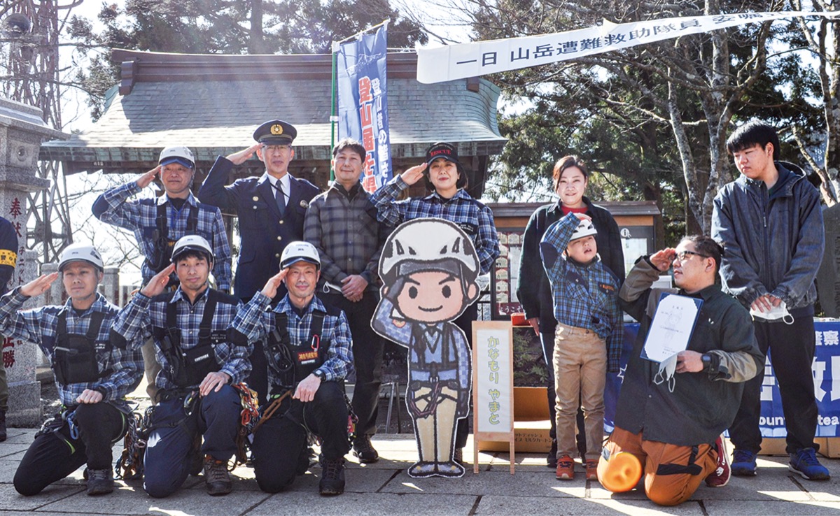 神奈川県警と伊勢原警察署は大山阿夫利神社(目黒仁宮司)下社で2月18日、春の登山シーズンを前に山岳遭難救助隊キャラクター「かなもりやまと」君と同姓同名の湘南養護学校1年生の金森弥真人君(7・平塚市在住)を一日山岳遭難救助隊員に委嘱、キャンペーンを実施した。