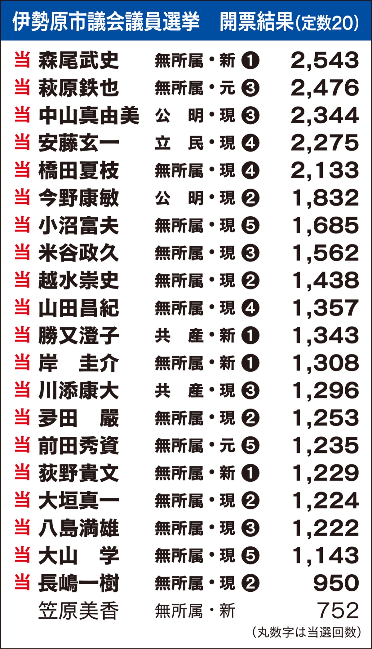 任期満了に伴う伊勢原市議会議員選挙の投開票が4月23日に行われ、20人の新しい顔ぶれが決まった。トップ当選は無所属で立候補した森尾武史氏(46)。投票率は39・64%で、過去最低だった前回をさらに4・85ポイント下回った。