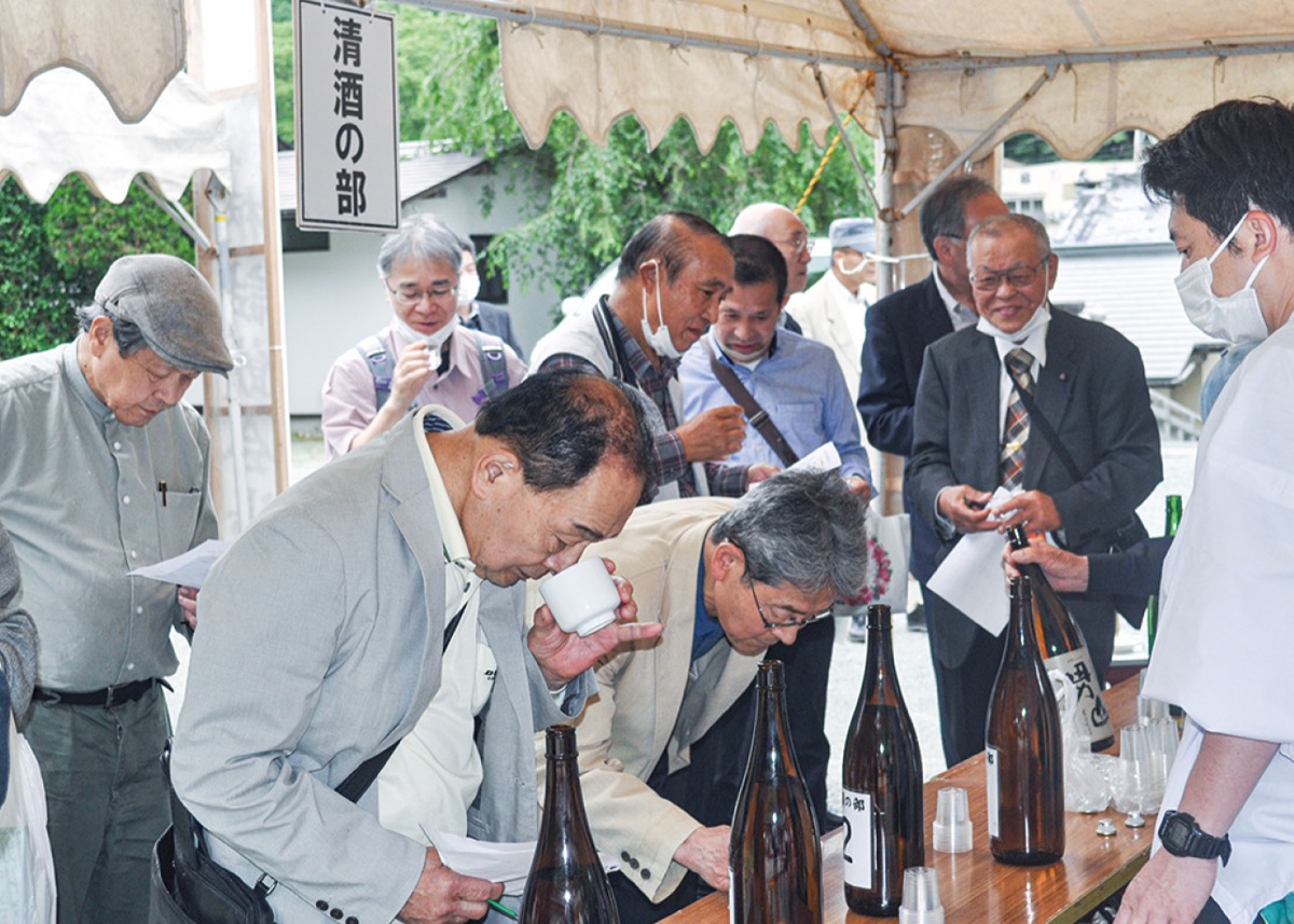 また、神事に先駆けて行われた清酒の部、ビールの部の利酒会では、廣田泰子さんに観光協会長賞、平本三義さんに金賞が送られた。参加者からは「なかなか難しいね」「どれも芳醇で素晴らしい香りと味。もうほろ酔い気分」などの声が聞かれた。同神社では「来年は一般参加者を招いて利酒会ができれば」と語っていた。