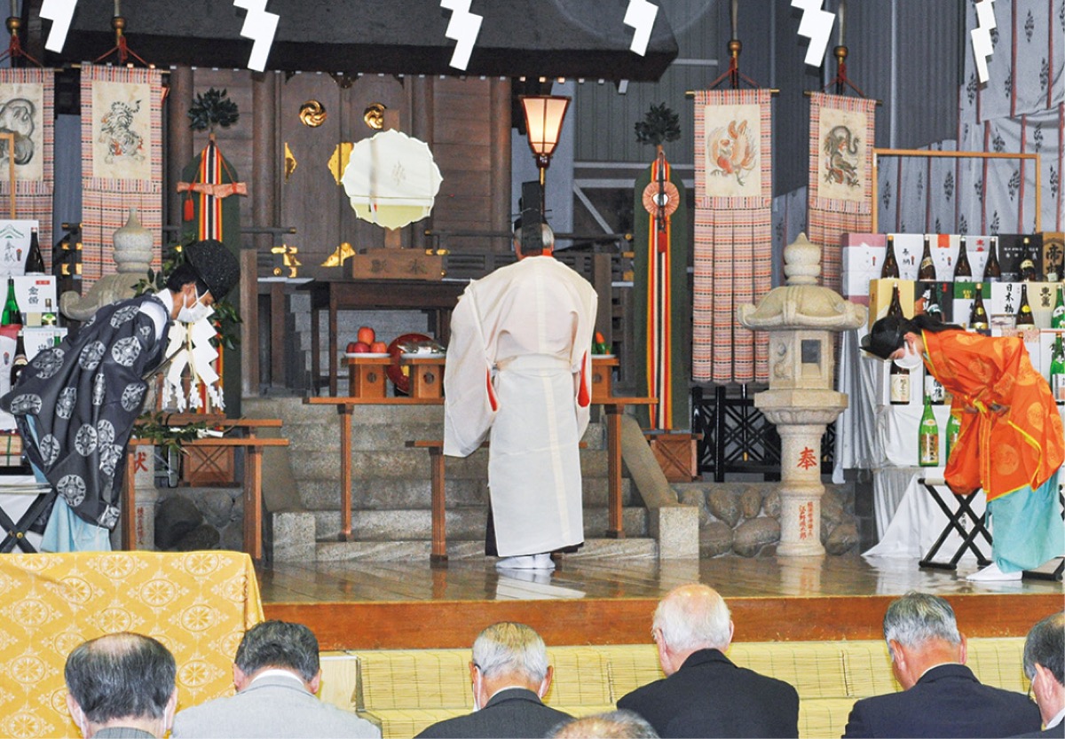 会場では厳かな雰囲気の中、神事が執り行われ、祝詞奏上や酒販組合関係者らによる玉串奉奠などが行われた。