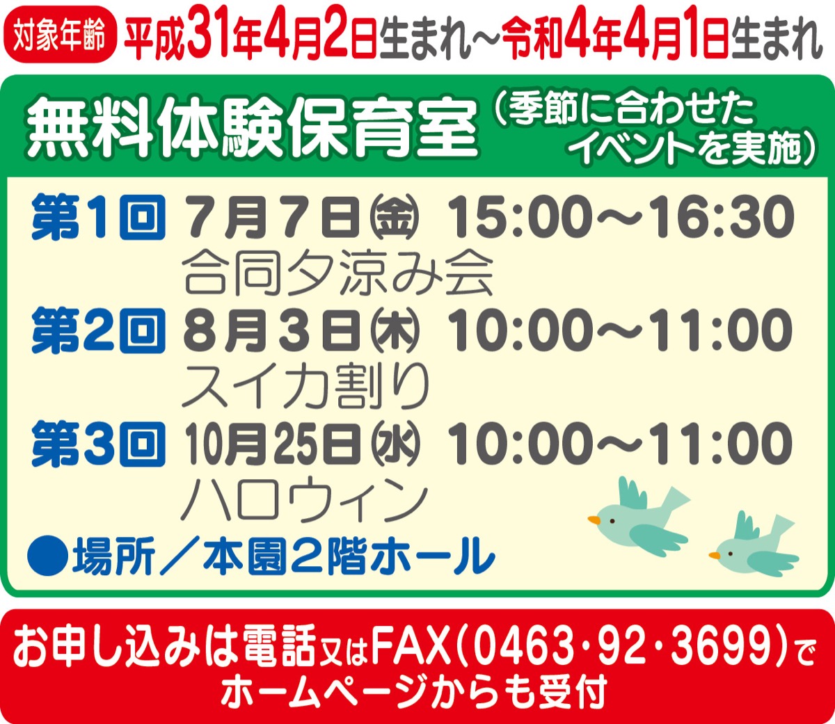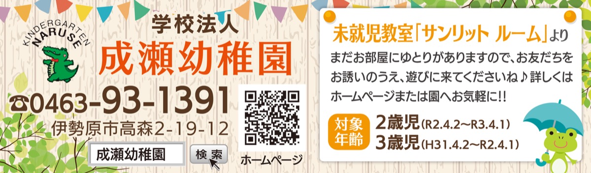 夕涼み会、スイカ割り、ハロウィンなど、20年以上の実績を誇る成瀬幼稚園の『無料体験保育室』に参加してみませんか。季節のイベントを中心に、体操やリズム遊び、製作や読み聞かせなど幼稚園教諭による指導もあり、子どもの集団生活体験や保護者の友だち作りにも最適。人気企画なので申込はお早めに。