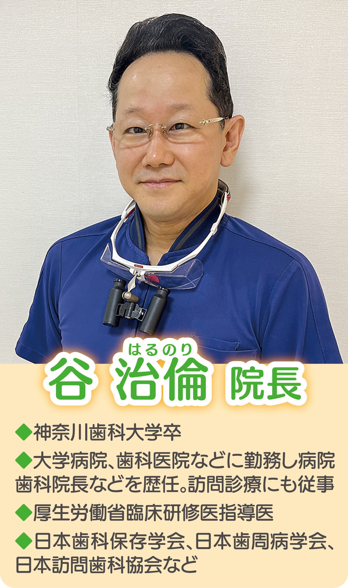 「医師と患者様が納得のいく治療を心掛けています。場合によっては時間を頂くことになりますが、このひと手間が、のちのち大きな差になります」と谷院長。さらに「人生の豊かさを支えてくれる歯の大切さを、より多くの方に認識して頂き、ご自分の大切な歯を少しでも長く維持して頂くためのサポートを続けていきたい」と話す。