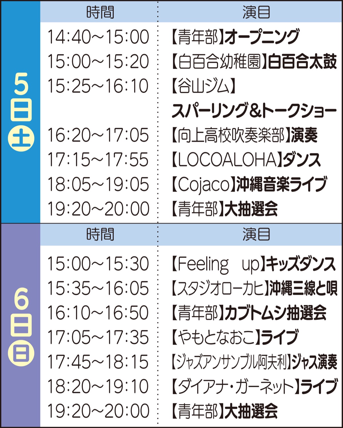 さらには地元出身のミュージシャンであるやもとなおこさんや沖縄を拠点に国内はもちろん海外でも活動し、「オリオンビールCMソング/いちばん桜」などの代表作をもつコジャコさん、ファーストオリジナルシングルで「NARUTO―ナルト―疾風伝」のエンディングテーマとなった「Spinning World」をリリースしたダイアナ・ガーネットさんのライブも行われる。