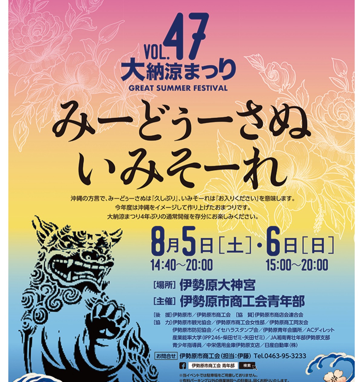 今年のテーマは「みーどぅーさぬ いみそーれ」。沖縄の方言でみーどぅーさぬは「久しぶり」、いみそーれは「お入りください」を意味している。「4年ぶりの通常開催となる大納涼まつりを存分に楽しんでほしい」との意味が込められた。また、「沖縄」のイメージを場内に取り入れ、沖縄文化に触れられるような企画なども予定している。